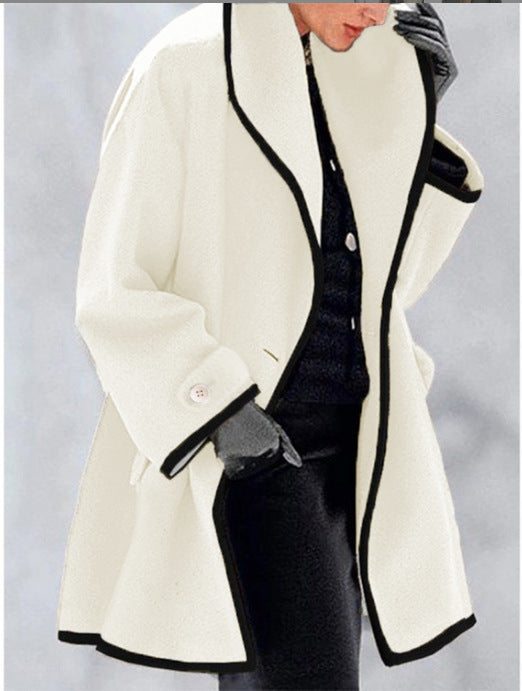 Step into timeless style with the Yumi Wool Blend Long Coat, designed for women who value elegance and comfort. With its large lapel collar, contrast trim, and relaxed silhouette, this coat combines sophistication with everyday wearability. Perfect for layering, it keeps you warm and polished through cold-weather outings or city strolls.