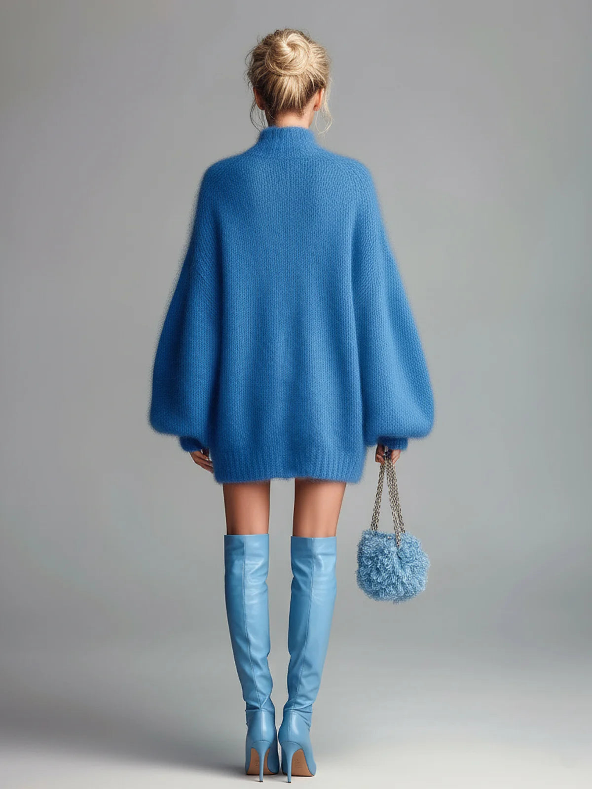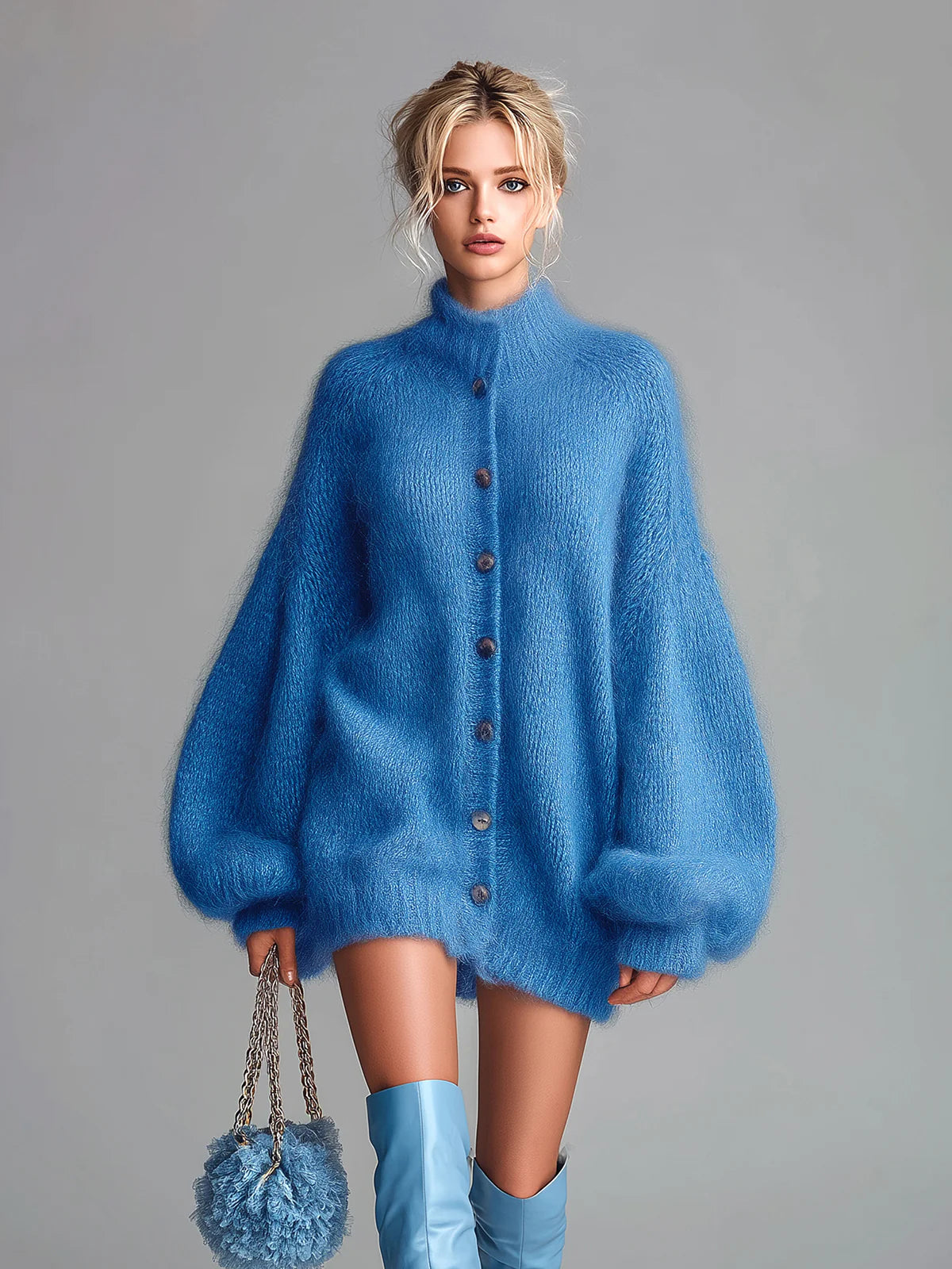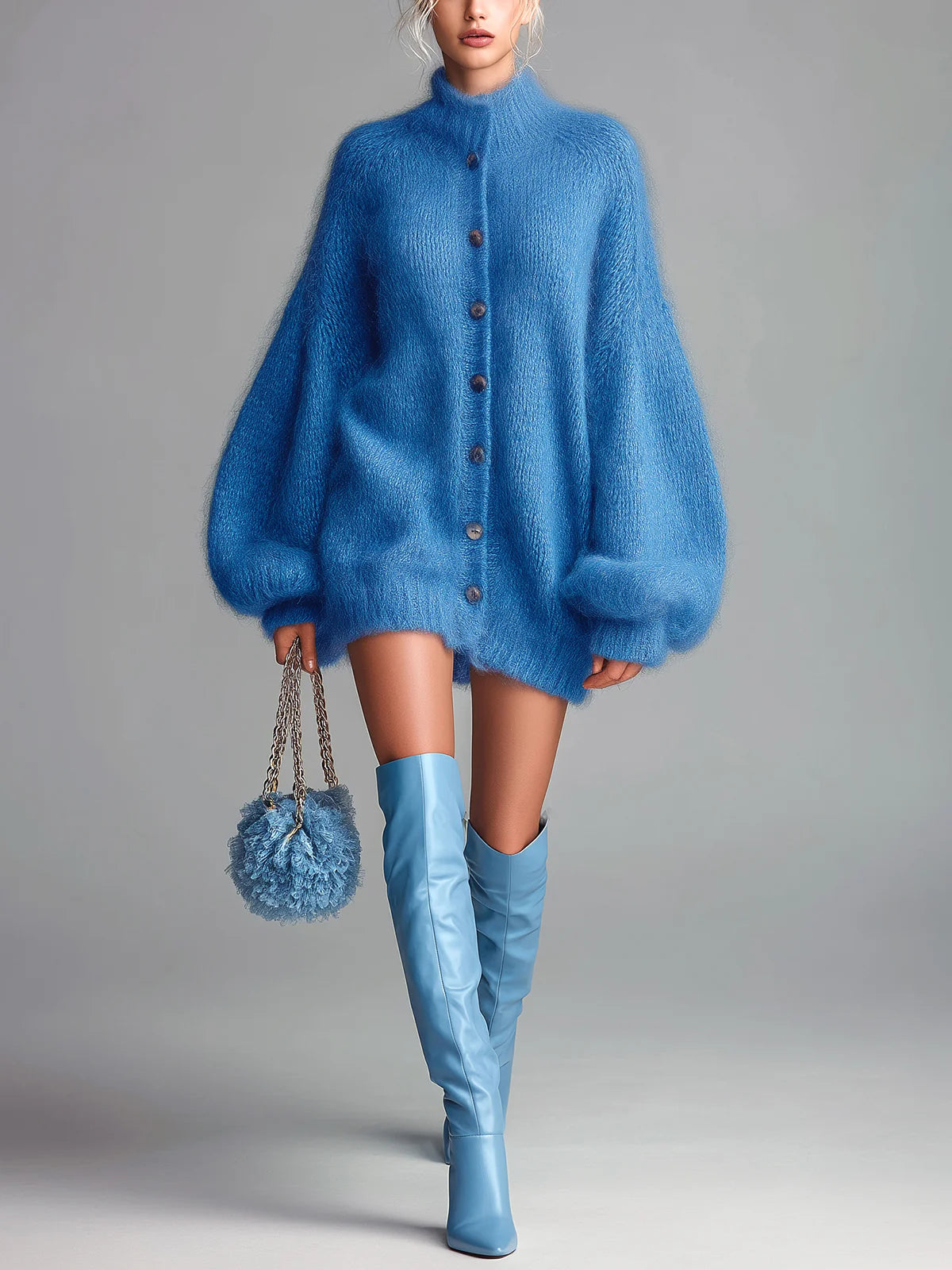 Chic Vintage Blue Mock Neck Single-Breasted Long Lantern Sleeve Oversized Fuzzy Knit Mini Dress