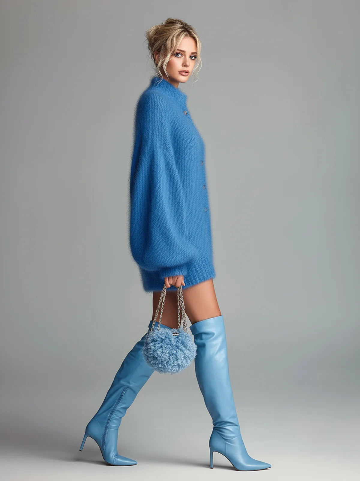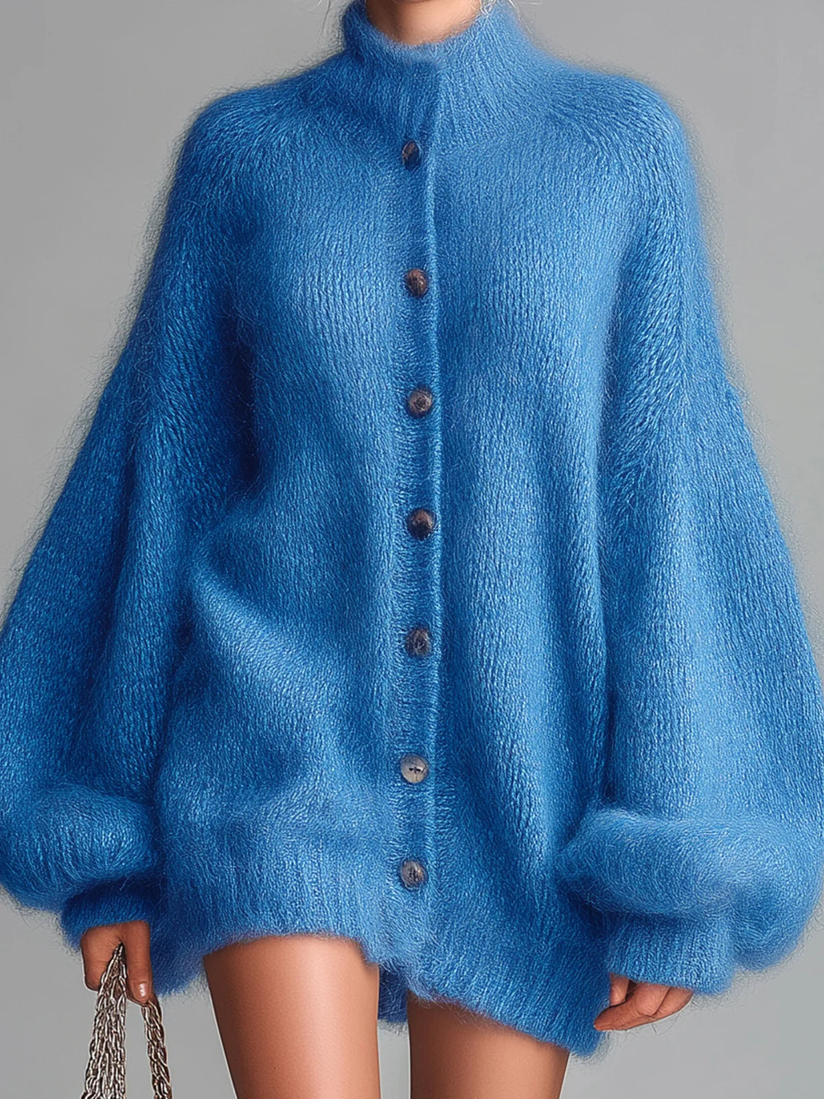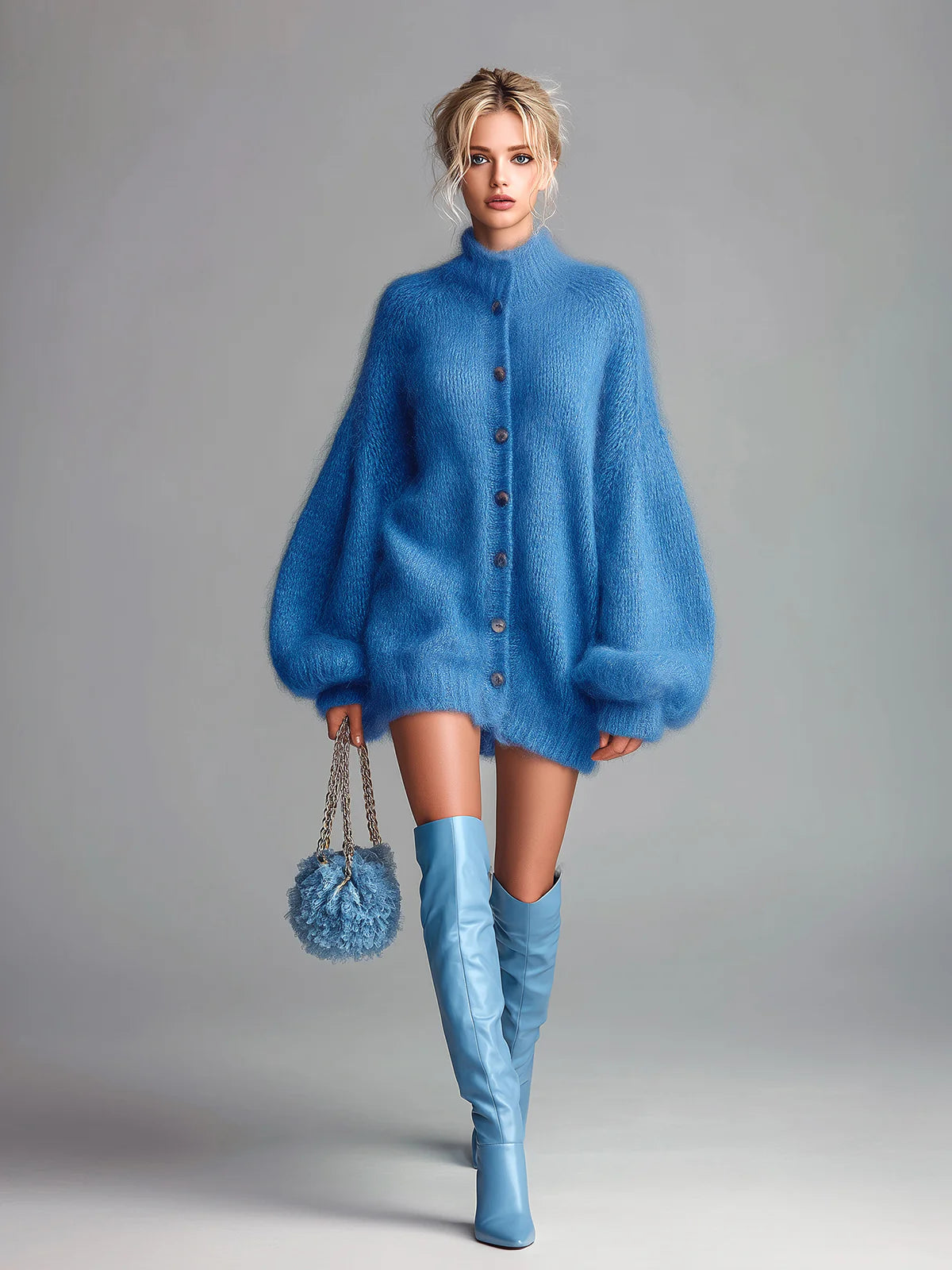 Chic Vintage Blue Mock Neck Single-Breasted Long Lantern Sleeve Oversized Fuzzy Knit Mini Dress