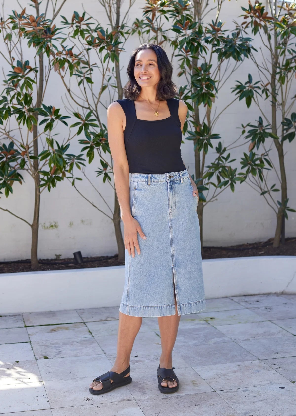 Meet the Emiry Denim Skirt—your new go-to for casual, easygoing style. With its light blue wash, midi length, and soft cotton blend, this skirt offers timeless versatility and comfort for every season.