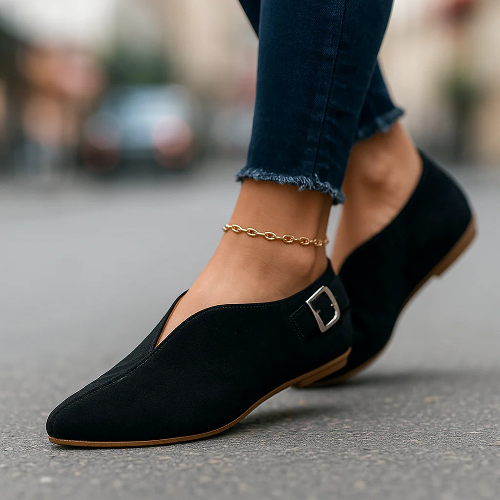 Crafted with a soft-textured upper and a cushioned insole, these flats deliver lasting comfort with modern appeal. The asymmetrical cut sharpens the silhouette, while the side buckle detail adds a touch of polish. A lightweight sole keeps the design practical for daily wear while still carrying a chic bold flair.
